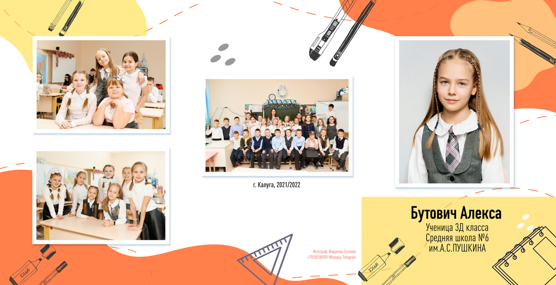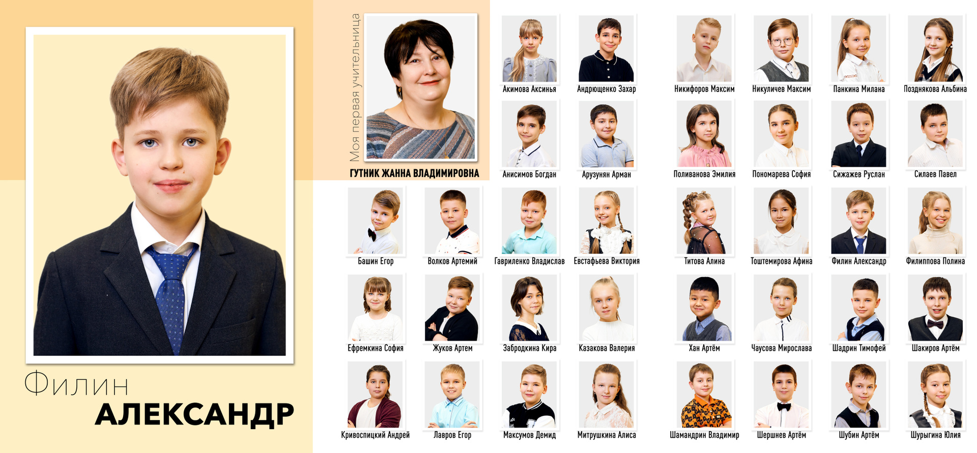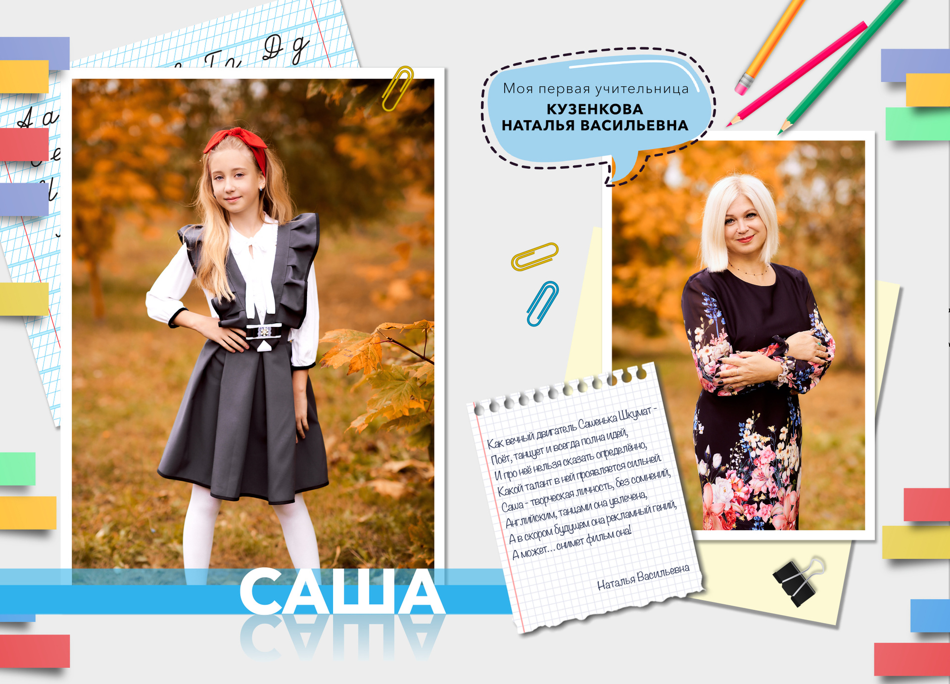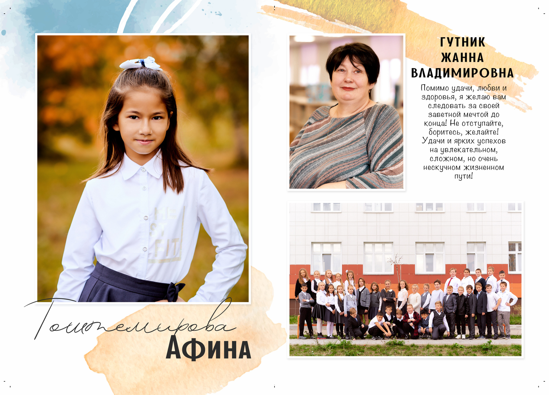 — 1 разворот персональный: портрет или портреты ребенка + фото учителя (учителей)