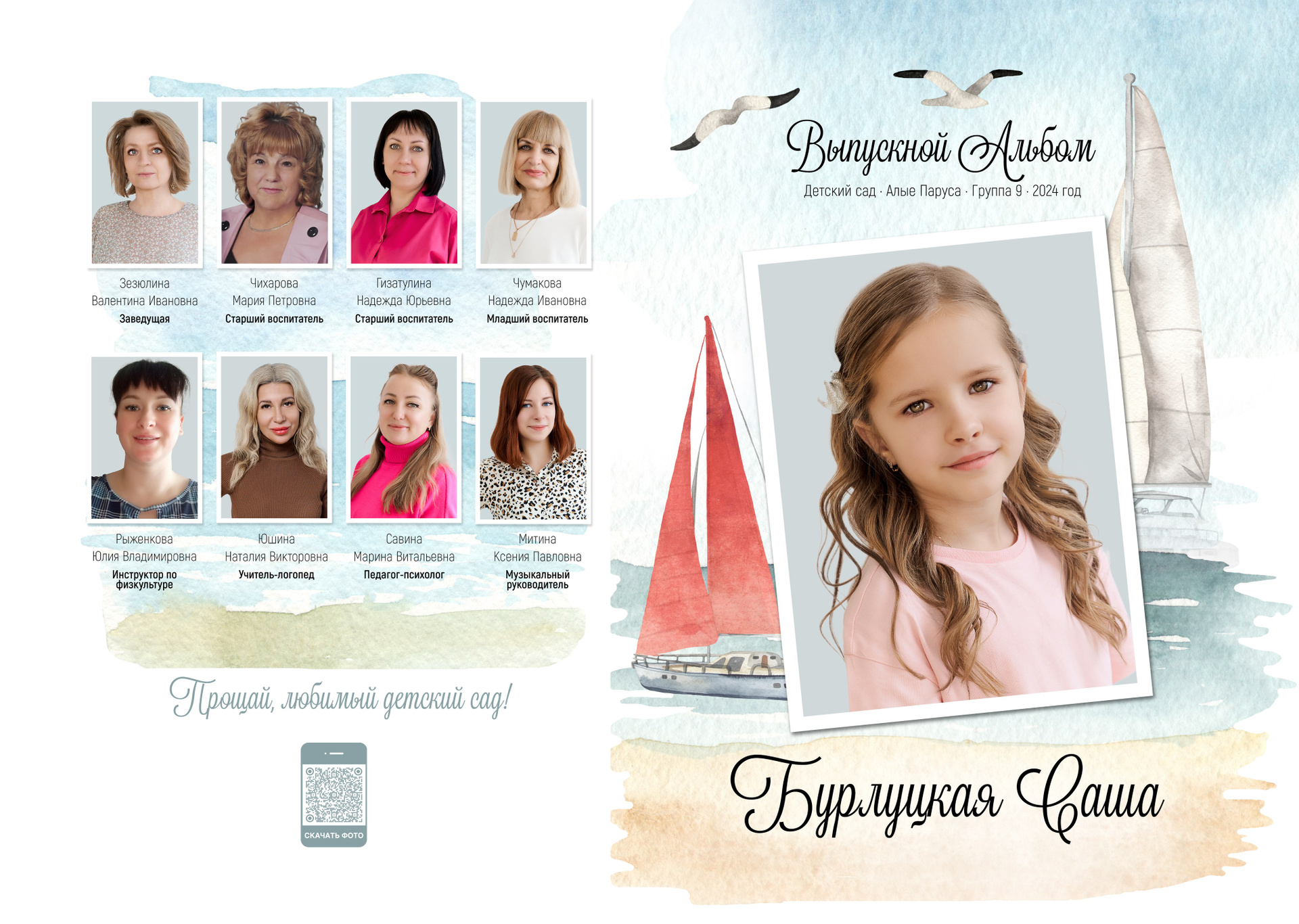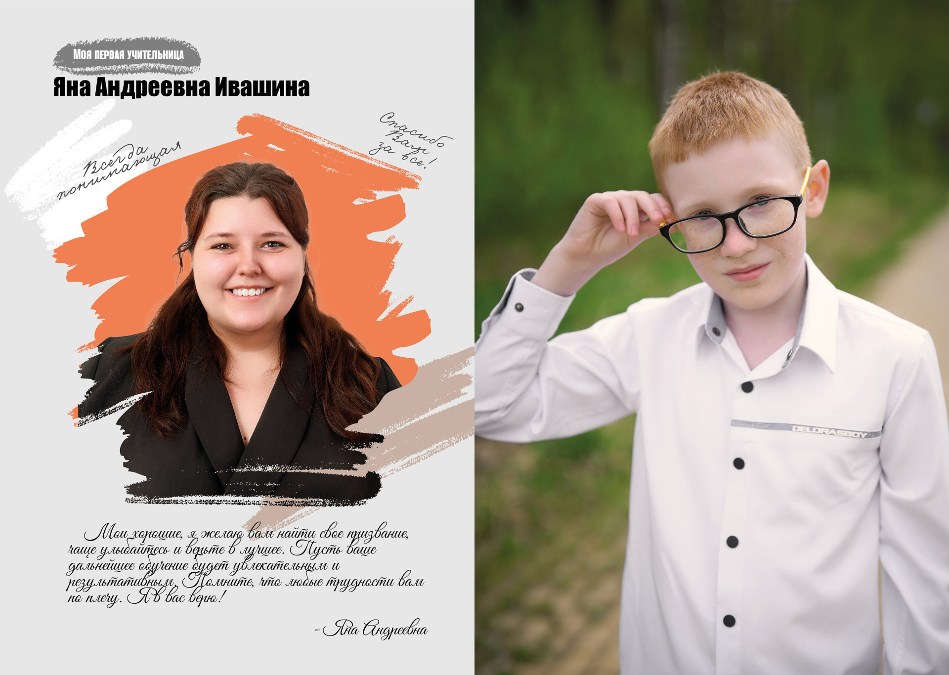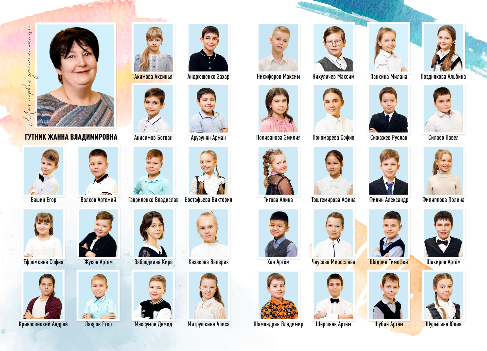 — 1 разворот персональный: портрет или портреты ребенка + фото учителя (учителей)